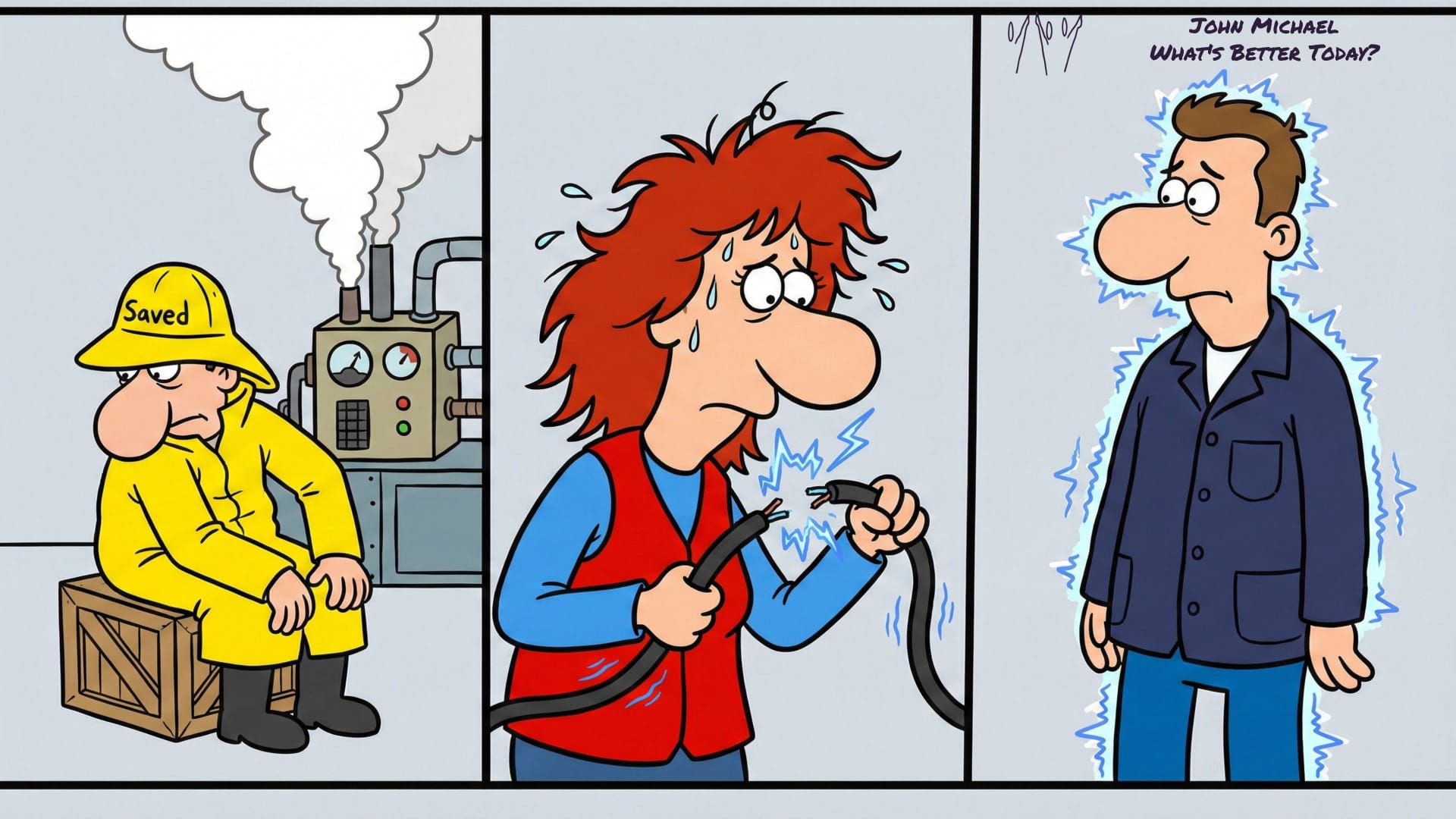 Static Sam shrugs at the wreckage of the project he abandoned. "God’s got it," he says. It is a spiritualised exit from responsibility. It sounds holy. It avoids engagement. Sam is tired. He calls his exhaustion faith. Next to him, Wired Wendy is hyperventilating, grabbing tools, and barking orders. She is self-sourcing, trying to power the entire grid with her own adrenaline.