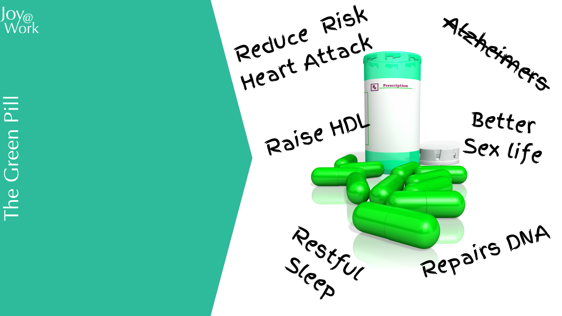 Imagine that someone created a green pill that adds years to your life; it reduces the risk of having a heart attack or stroke; cuts your risk of Alzheimer's disease by more than fifty percent; helps you relax during the day and sleep better at night; it doubles your chances of staying drug and alcohol free after treatment; activates your natural killer cells; diminishes your inflammatory cells; increase your good cholesterol (HDL); and it repairs your DNA.