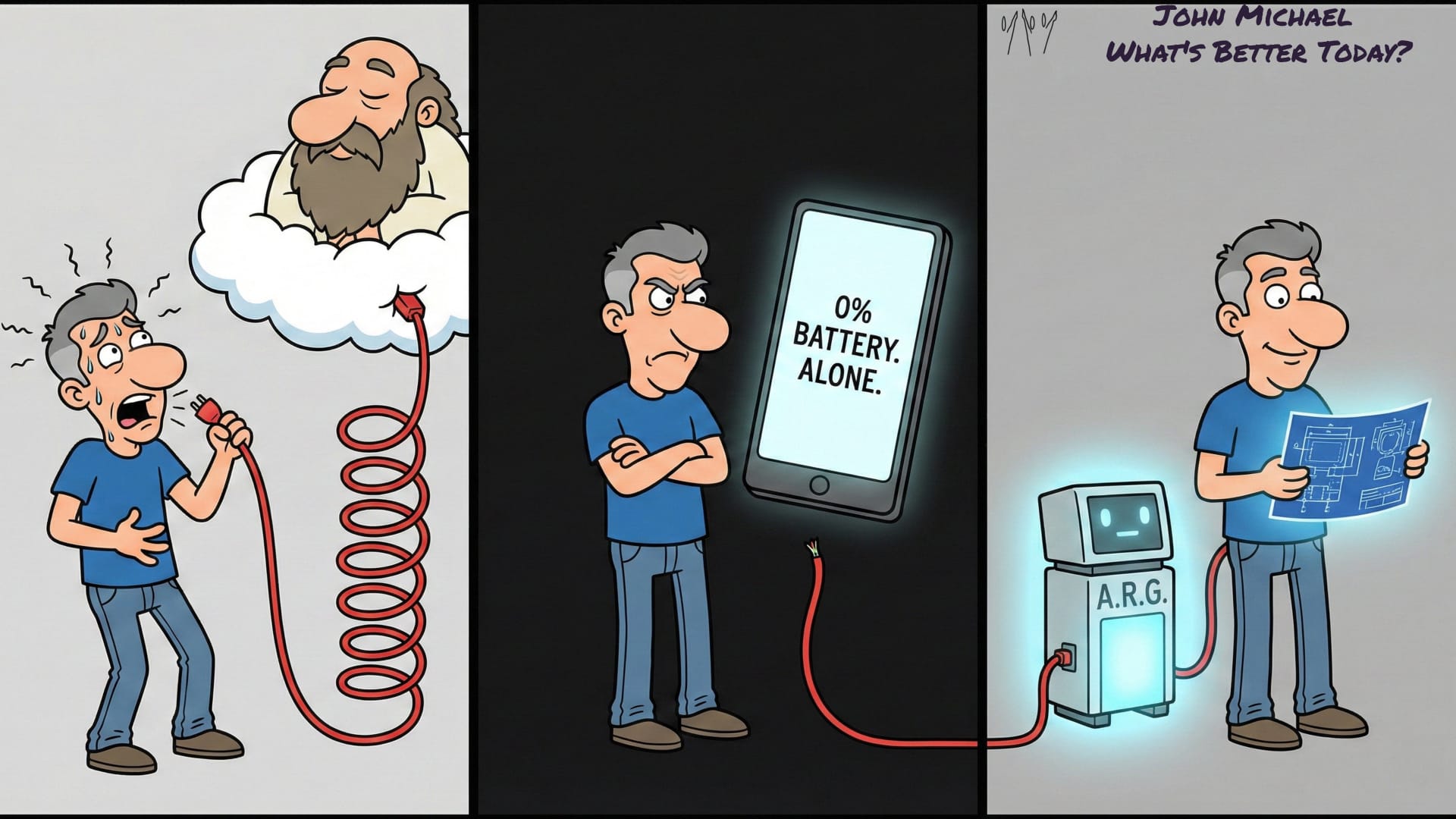Alex stares at the phone. He is paralysed. He knows the theology, he knows the verses, but right now, without the external voice to tell him what to do, he is functionally offline. He is a lamp sitting in the dark, clutching an extension cord, waiting for someone else to find the outlet.