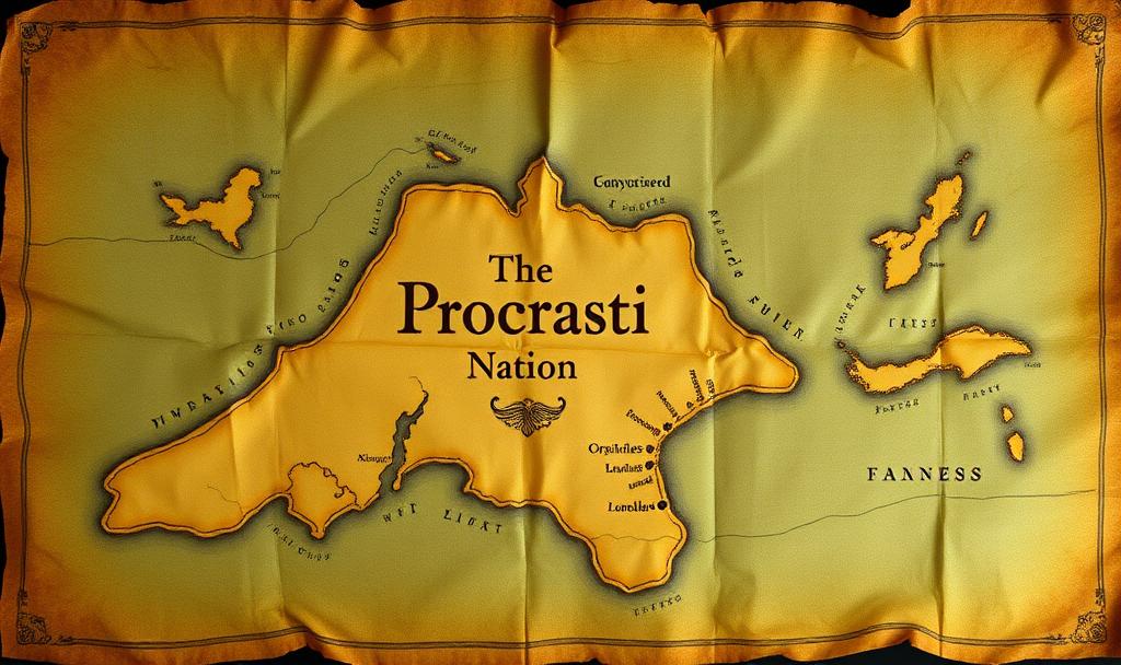 An old treasure map of an island nation labelled “The Procrasti Nation”